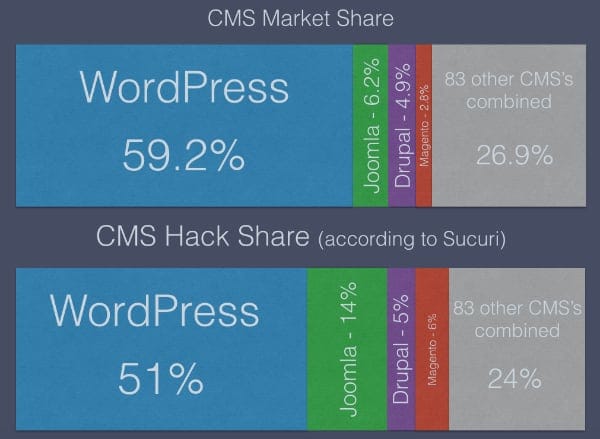 In the image below you can see that WordPress is actually MORE secure than the other Content Management Systems available.